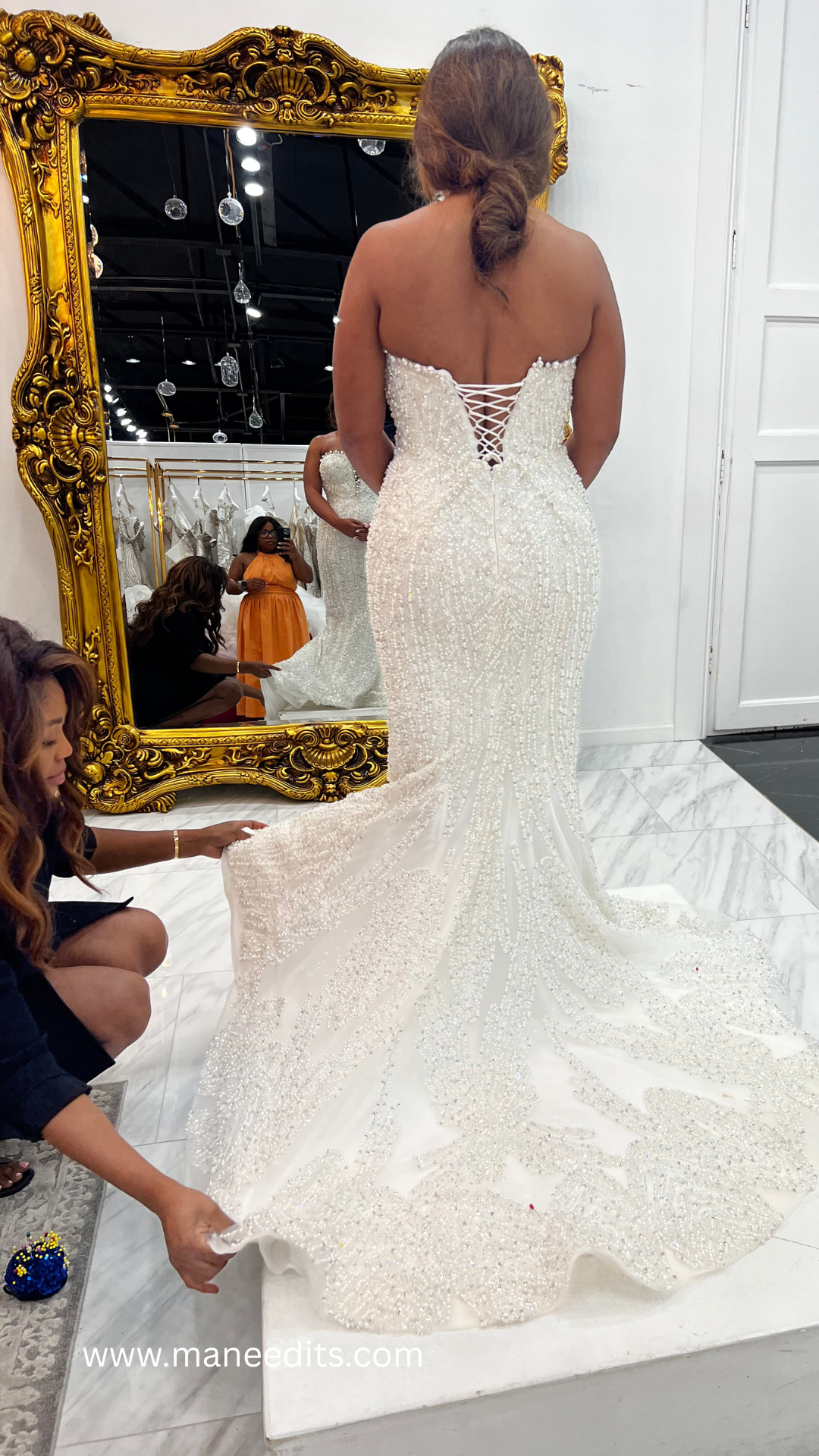 As a bridal hairstylist, meeting Esé Azénabor-Grembowski reminded me just how beautiful this industry can be when purpose, passion, and preparation collide. I’ve admired her work for quiet some time – her gowns speak volumes — elegant, architectural, romantic, and elite. During Dr. B’s bridal dress fitting, Esé emerged from the back with a warm greeting and some bubbly! It was a pleasure meeting her and seeing Esé in her element behind the scenes making magic on three different bridal gowns (1 wedding gown for the bride and 2 gowns for the mother)! As a fellow black woman entrepreneur, I asked if she was OK with me asking her a few questions and she said absolutely! What followed was a short but deeply impactful conversation that left me inspired and affirmed